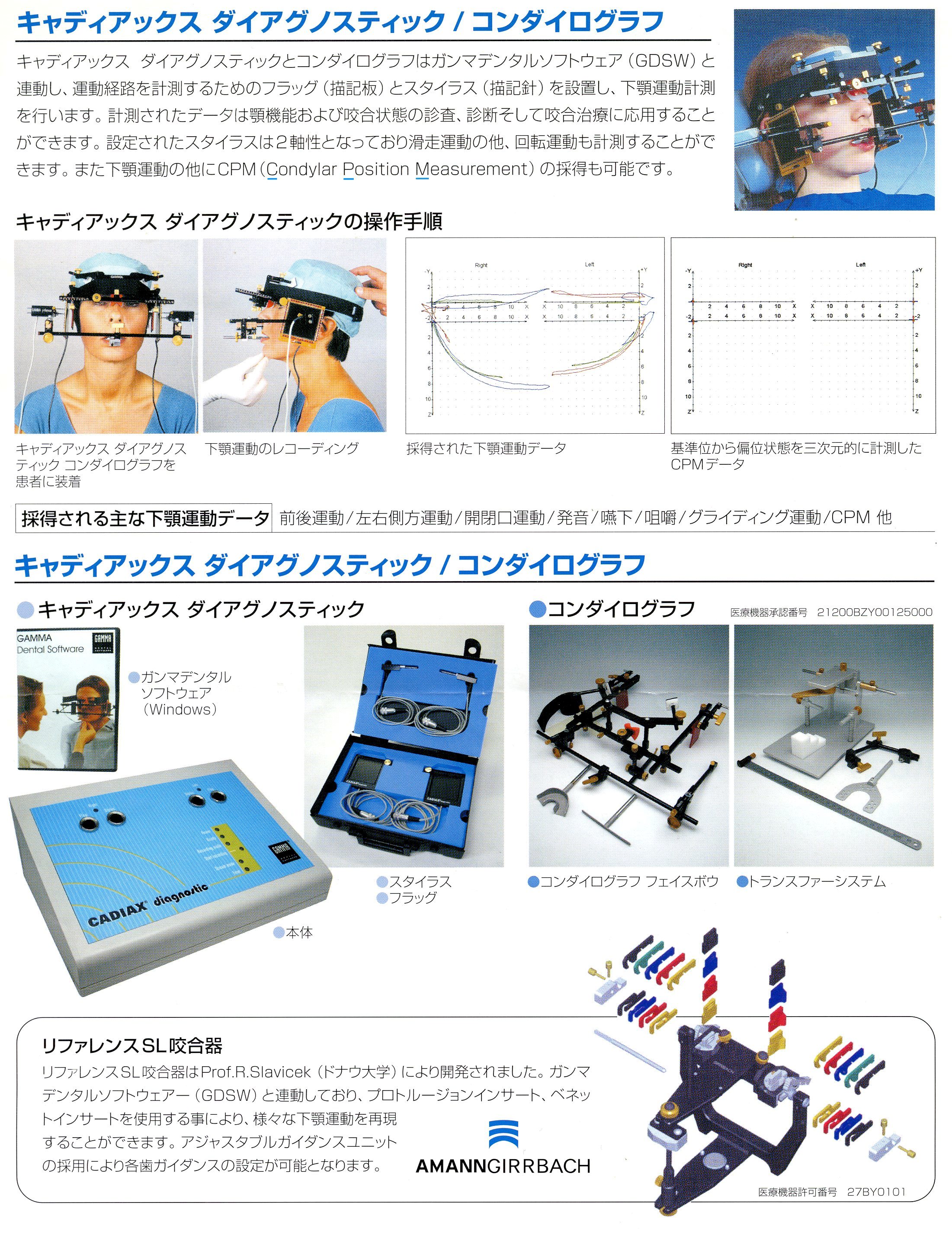 キャディアックスダイアグノスティックスは下顎運動測定装置です。顎の動きの軌跡をコンピューターで解析、患者さんの持つ個々の骨格的形態分析、病態を把握し、「かみ合わせ」が最適化した、被せ物の作成や矯正治療に有効です。